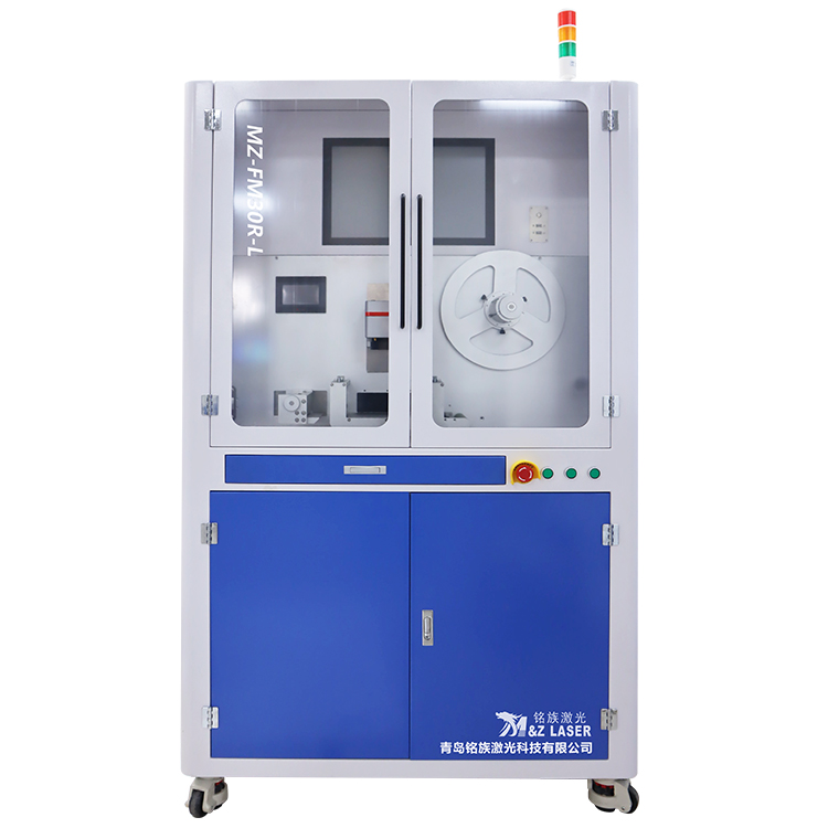 MZ-FM30-RL是一款全自動(dòng)3M標(biāo)簽激光打標(biāo)機(jī),其工作臺(tái)上安裝全自動(dòng)放卷送料系統(tǒng),人工將一卷標(biāo)簽紙安裝好后并將整卷標(biāo)簽紙送入導(dǎo)向板后壓緊,人工啟動(dòng)打標(biāo)開關(guān),標(biāo)簽紙自動(dòng)走到打標(biāo)位置真空吸附平整觸發(fā)激光打標(biāo),標(biāo)簽紙打標(biāo)完成,標(biāo)簽紙運(yùn)動(dòng)到切紙位置,切紙機(jī)構(gòu)壓緊標(biāo)簽紙,自動(dòng)切紙后退回到原位,切紙機(jī)構(gòu)松開標(biāo)簽紙,標(biāo)簽紙掉落到接料盒收納,打標(biāo)機(jī)進(jìn)行下一張標(biāo)簽紙打標(biāo)循環(huán),整卷紙根據(jù)人工或者M(jìn)ES系統(tǒng)給的